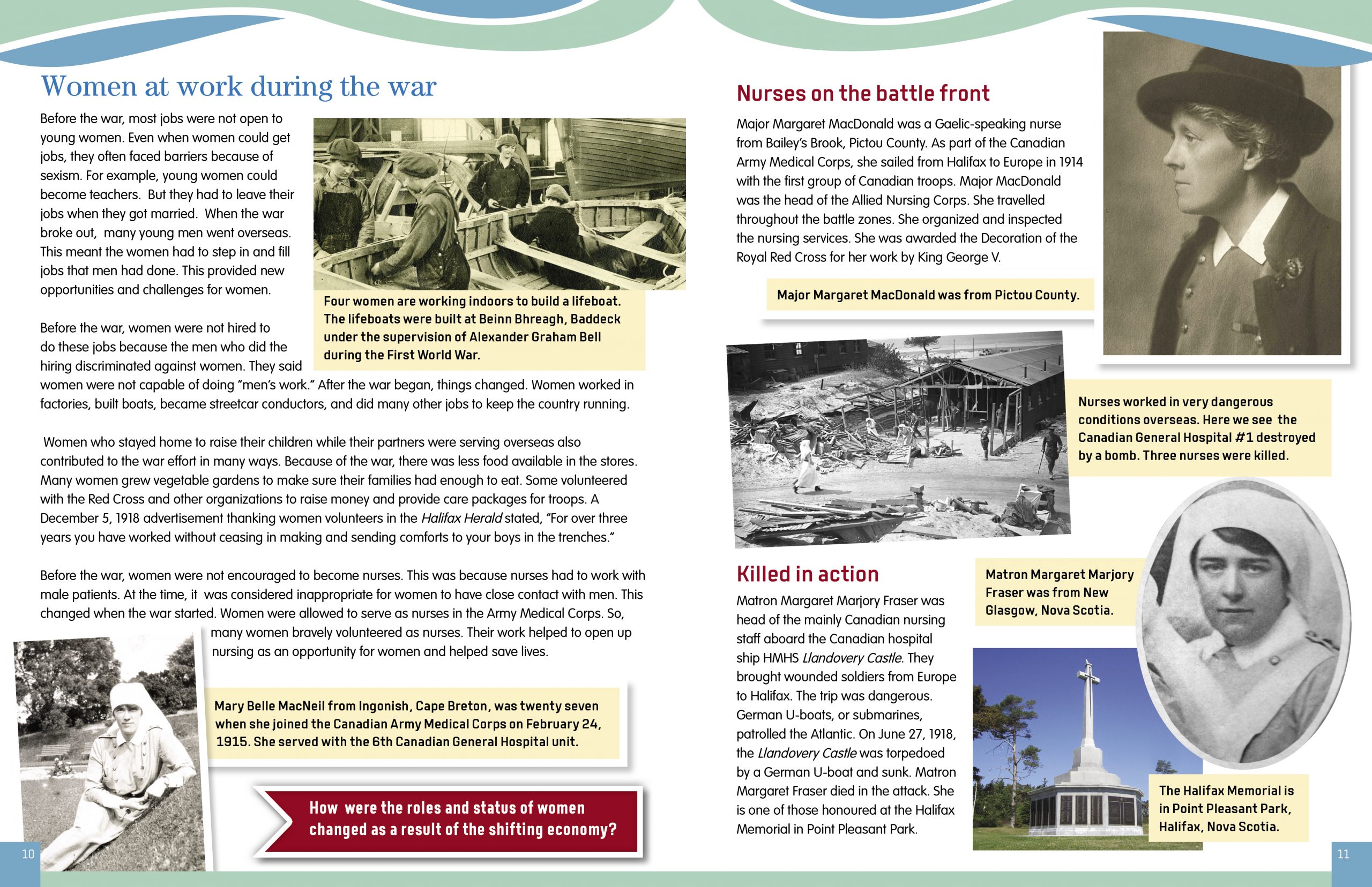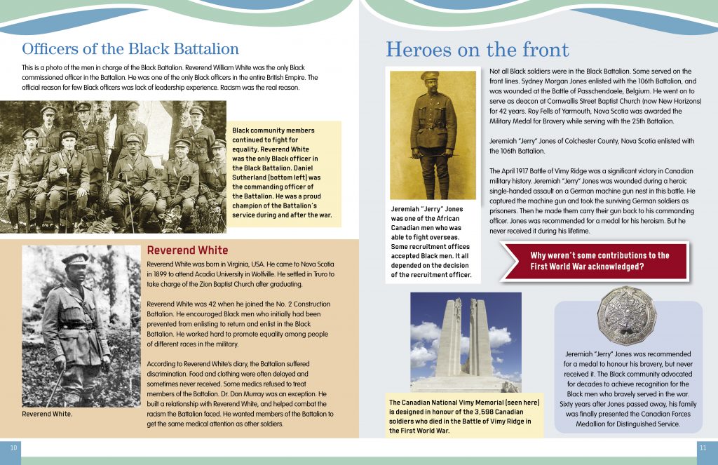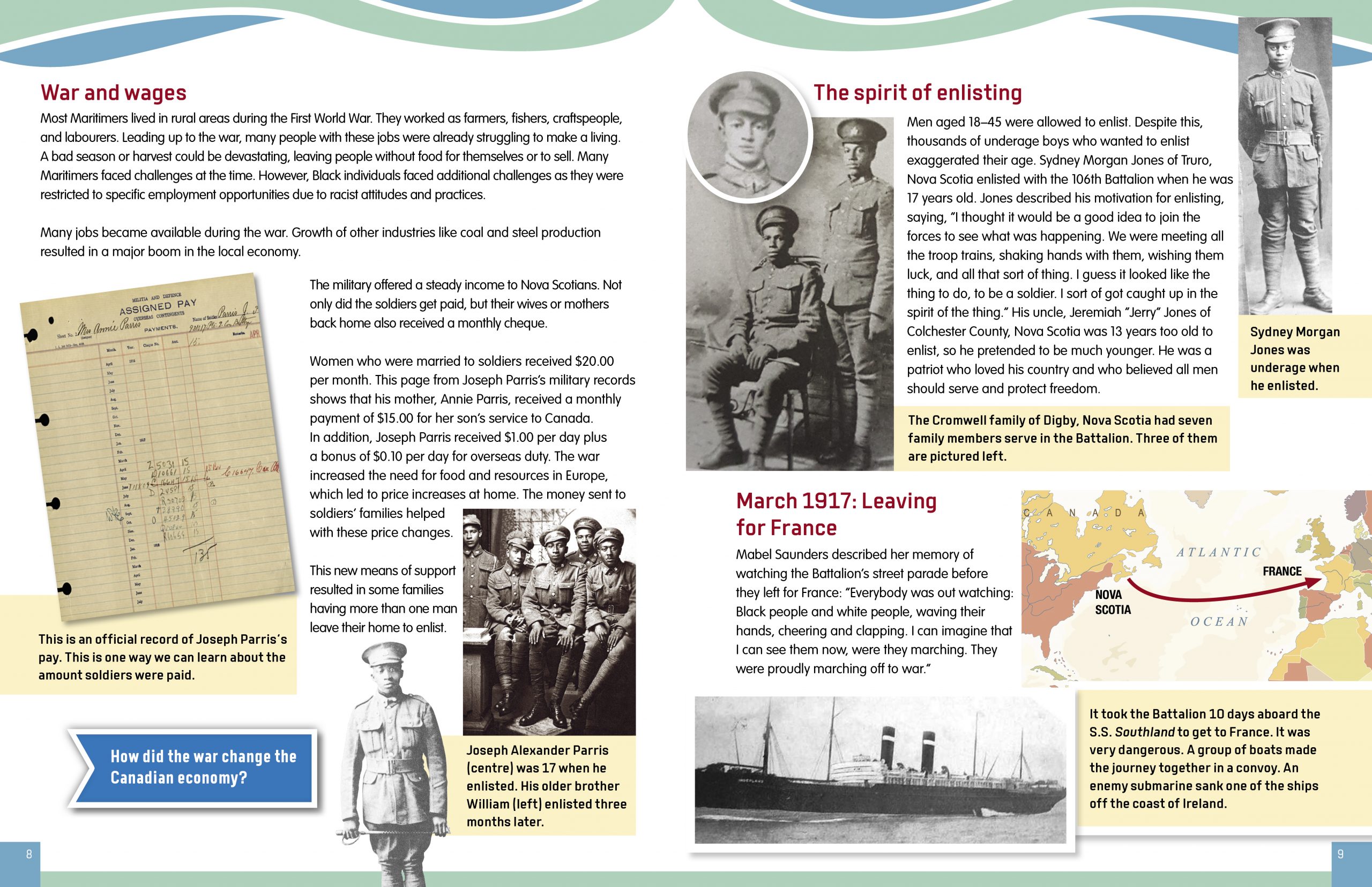 Four booklets explore the experiences of each of the four groups during the First World War. Readers will learn about the recruitment and deployment of segregated fighting units including the 165th Acadian Battalion, the Gaelic 185th Cape Breton Highlanders, and the all-Black No. 2 Construction Battalion. The experiences of Mi’kmaw soldiers who voluntarily enlisted are described in the fourth booklet.