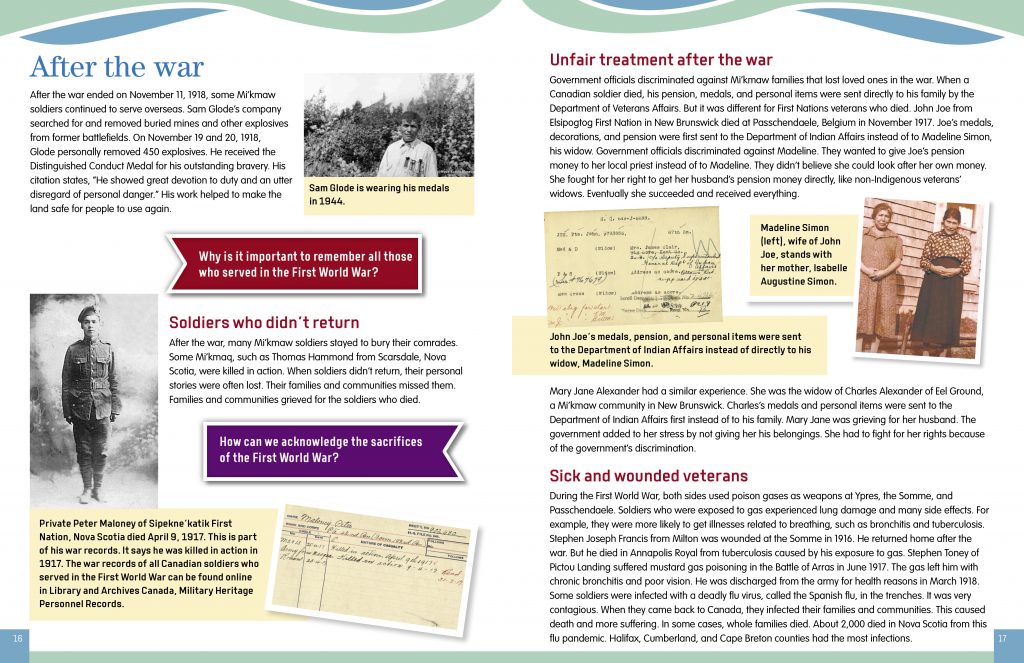 When the British government enlisted Canada to join the First World War in Europe, many Mi’kmaq chose to sign up only to have Canadian military authorities reject them. Later in the war, the military changed its policies because they needed more recruits and again several hundred Mi’kmaq volunteered. This booklet describes the experiences of Mi’kmaw soldiers in Europe and of Mi’kmaw families in Canada during the war, with the devastating impact of the Halifax Explosion on the Mi’kmaw community of Turtle Grove described. Also explored is the systemic racism in Canada that pre-empted the many unfair ways in which Mi’kmaw veterans and their families were treated after the war. But the veterans and their families continued to demand equal treatment and full recognition for their contribution to the Canadian war effort, recognition that has come in recent years.